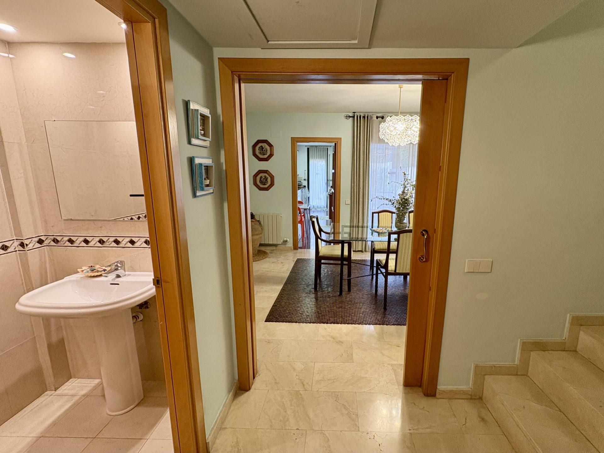 Planta principal: Amplio salón muy luminoso con gran ventanal exterior, comedor independiente con puertas correderas y acceso directo al jardín, cocina completamente equipada y aseo de cortesía.
